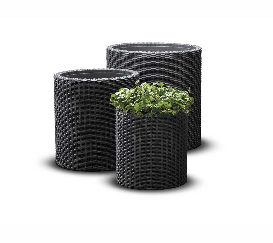 Набор кашпо CYLINDER PLANTERS SET - это набор из трех горшков, выполненный в классическом стиле. Текстура, имитирующая плетение из натурального ротанга, прекрасно подойдет к любому саду, террасе или балкону. Идеально подходит как для вьющихся растений, так и для классических композиций из растений. Благодаря используемым для производства высококачественным пластмассам, горшки устойчивы к внешним погодным условиям. Встроенная система дренажа для слива избыточной воды является дополнительным преимуществом этих кашпо.